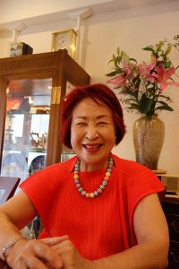 赤い髪は30年くらい前、ちょっと白いものが見え始めて、茶色は平凡だし、赤で染めたんです。お洋服に、着物にも赤だと明るく見えるし、何にでも合うんです。パステルでも、紫や黒を着ていても暗くならないですね。