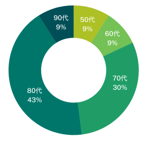 割合としては、50代9%、60代9%、70代30%、80代43%、90代9%でした。