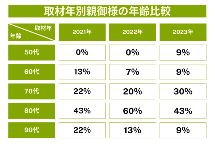 2021年、2022年は50代の方の制作はゼロだったのですが、2023年は9%を占めました。また、70代の割合が2021年は22%、2022年は20%なのに比べ、2023年は30%という結果でした。2023年はお若い方の取材が多いという感覚があったのですが、数字にしてみても50~70代の方が48%となり、感覚と一致していたと思いました。