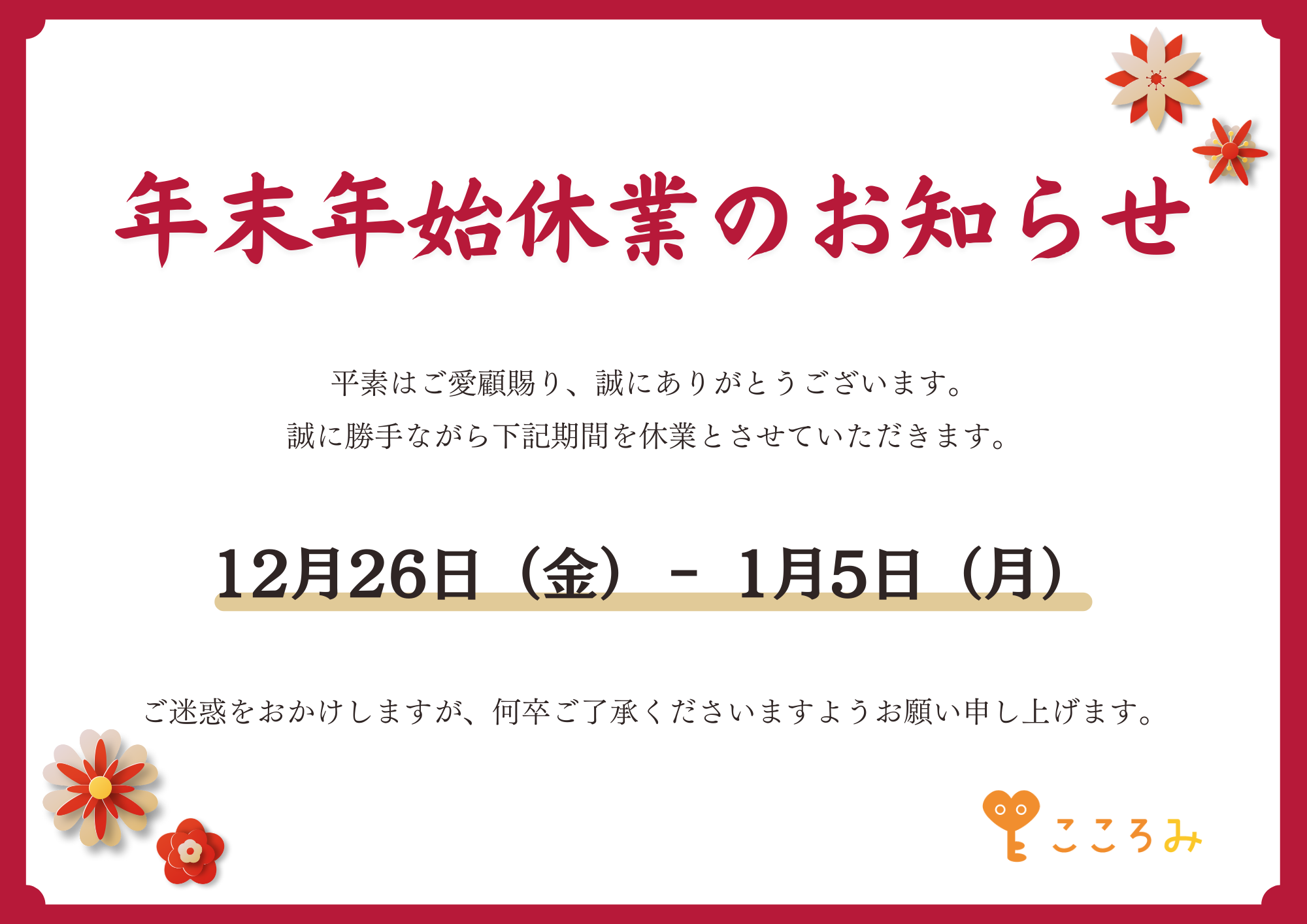 平素は格別のお引き合いを賜り、厚くお礼申し上げます。 誠に勝手ながら、2025年12月26日(金)~ 2025年1月5日(月)まで、 株式会社こころみは年末年始休業とさせていただきます。ご不便をおかけしますが、何卒ご理解いただきますようお願い致します。
