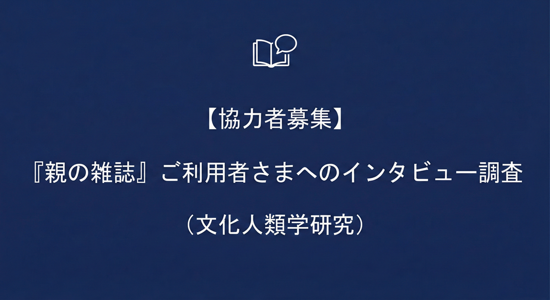 平素より『親の雑誌』をご利用いただき、誠にありがとうございます。このたび、『親の雑誌』を作成された方を対象にした研究インタビュー(聞き取り調査)について、研究者の方よりご協力依頼をいただきました。